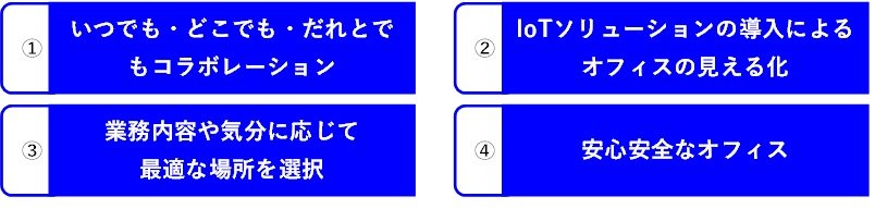 ワークスペースを用意し、個人がデスクを固定せず、作業内容に応じて働く場所を変えられる勤務形態です。